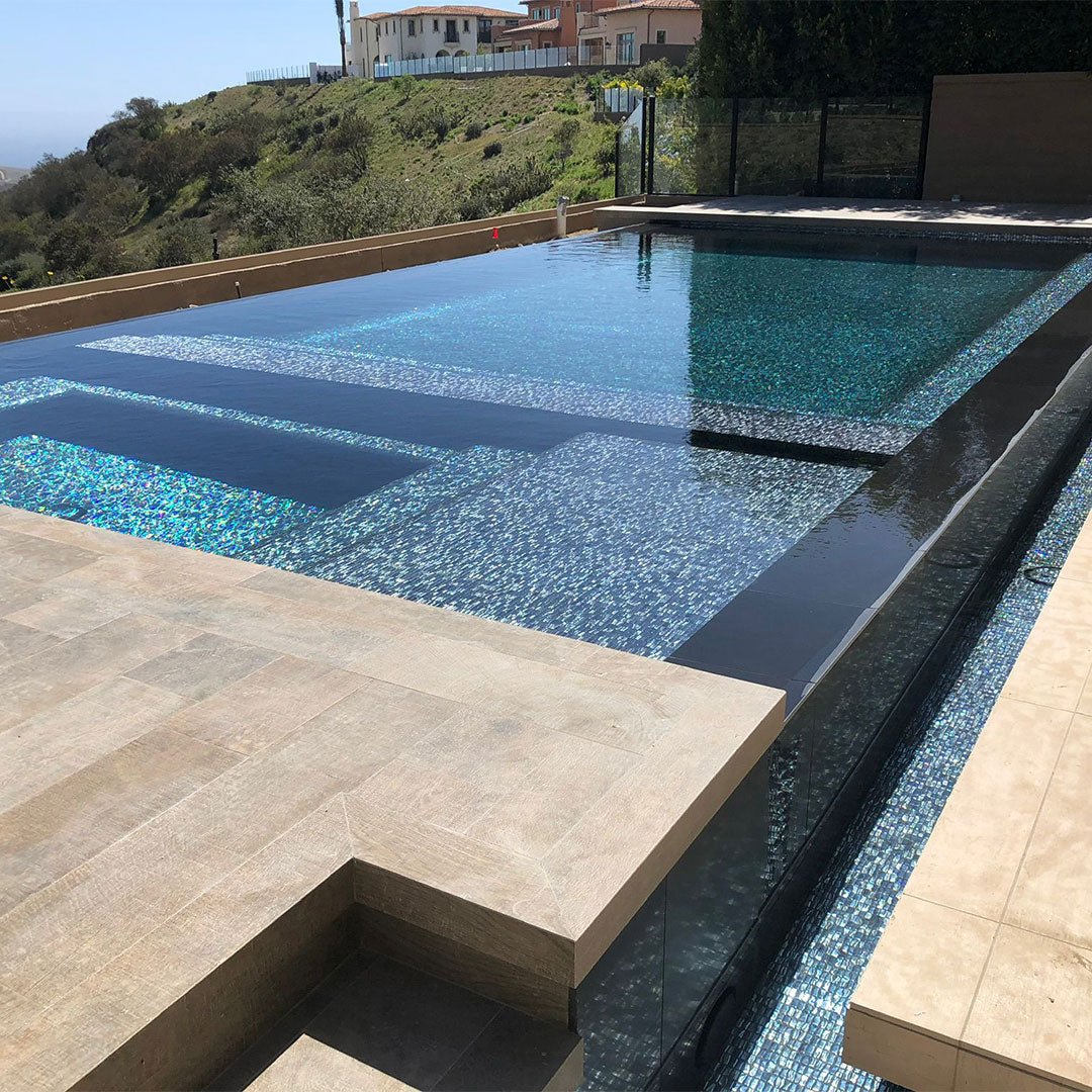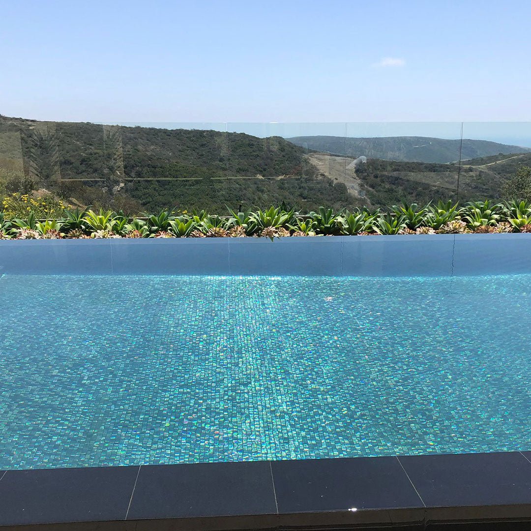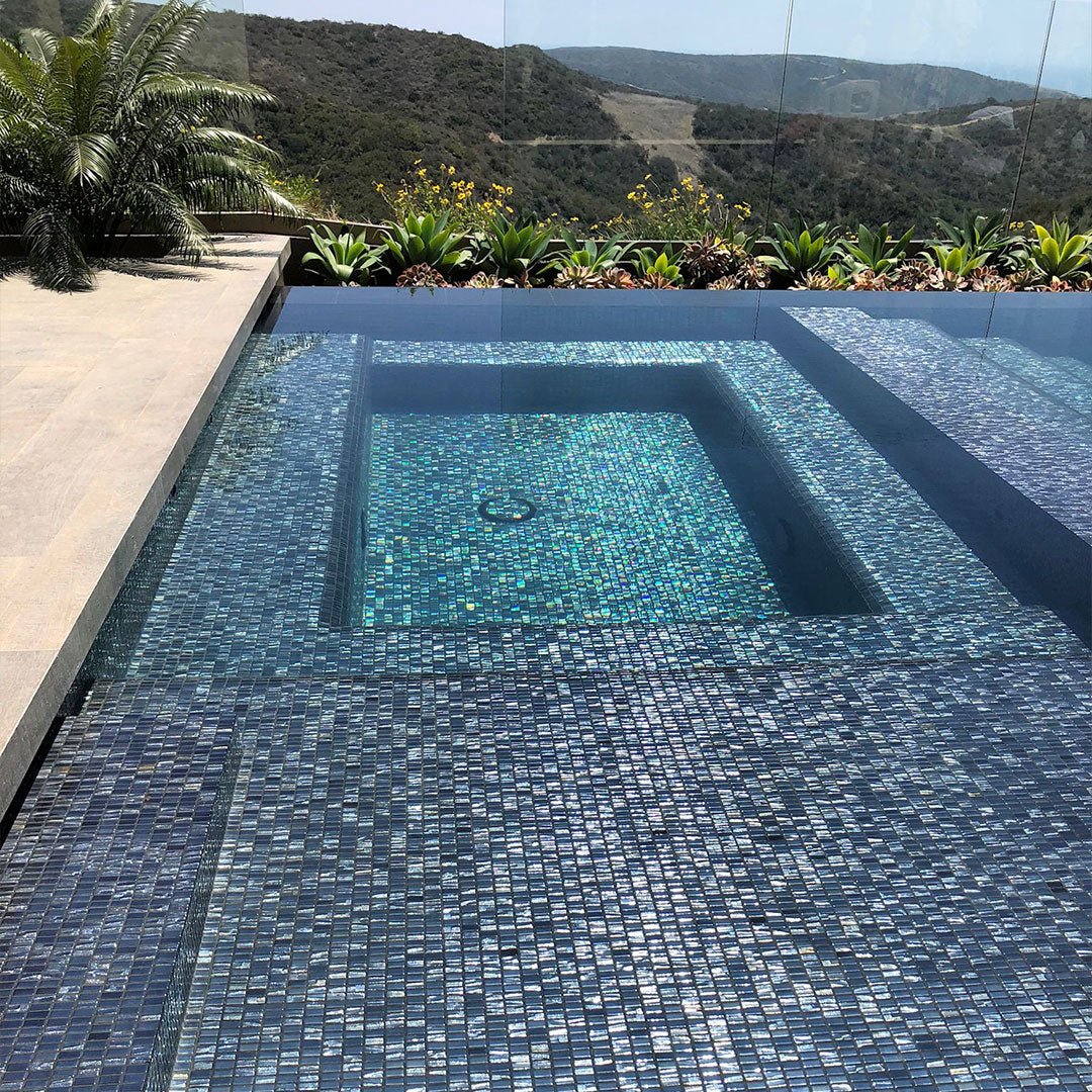 These mesh - mounted, frost proof pool tiles aren’t just for water features - they also shine in interior spaces. From bathroom showers and kitchen backsplashes to decorative walls, the Bijou Series adds elegance and artistry wherever it’s installed. If you’re looking to infuse your space with style, sustainability, and timeless design, the Bijou Series is the perfect addition to your pool or interior design vision. Start your journey to a personal paradise today - order a sample and experience the unmatched elegance of Bijou glass pool tiles.