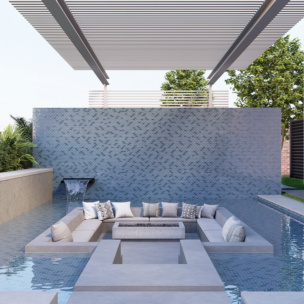 Transform your aquatic retreat or living space with the cutting-edge design of the Reflections Collection by Murrine Mosaics. This striking collection of glass mosaics brings bold dimension and visual interest through a sophisticated combination of 3D textures, iridescent finishes, and clean linear forms. Designed to captivate, these tiles reflect light beautifully, creating shimmering surfaces that add depth and drama to pools, spas, bathrooms, kitchens, and feature walls. This series offers versatile sizing and layout options, including 1 - 1/2" x 1 - 1/2" square tiles, elongated 1 - 1/2" x 3" brick formats, and artistic splash patterns - each tailored for seamless integration into contemporary spaces. Whether you're designing a sleek all-glass pool, enhancing a luxurious spa environment, or crafting a show-stopping kitchen or bathroom backsplash, these tiles deliver an elegant yet edgy aesthetic that stands out.