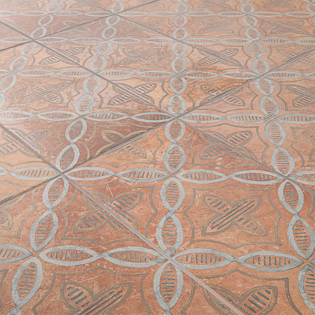 Cotto Decoterra Porcelain Tile is the perfect combination of artistry, durability, and timeless design. Expertly crafted, this striking patterned porcelain tile features a captivating geometric floral motif created from interlocking circular and oval shapes, offering a sophisticated visual appeal that instantly elevates any space. The vintage-inspired, slightly weathered finish gives each tile unique character, while the warm, earthy cotto color with subtle tonal variations adds natural depth and charm, creating a welcoming and refined ambiance.