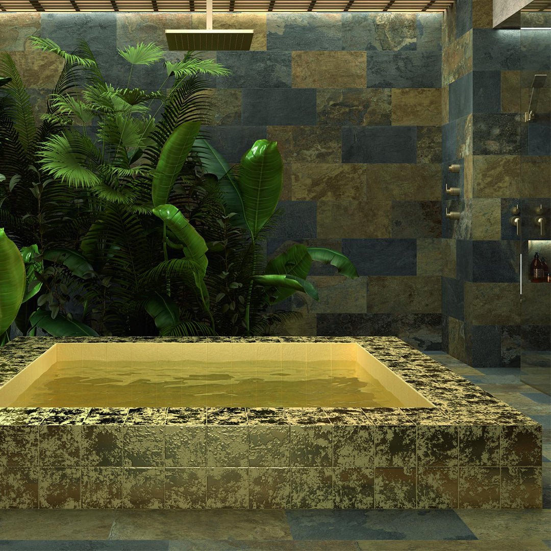 Designed for both pools and high-end decorative spaces, Golden Stone elevates interiors and exteriors alike. Whether used as a shimmering accent in a luxurious swimming pool, a bold statement on feature walls, or an eye-catching detail in modern architecture, this tile’s durability and water resistance make it as practical as it is beautiful. Perfect for luxury resorts, spas, or elegant outdoor living areas, the Golden Stone tile transforms any area into a refined, visually striking masterpiece.