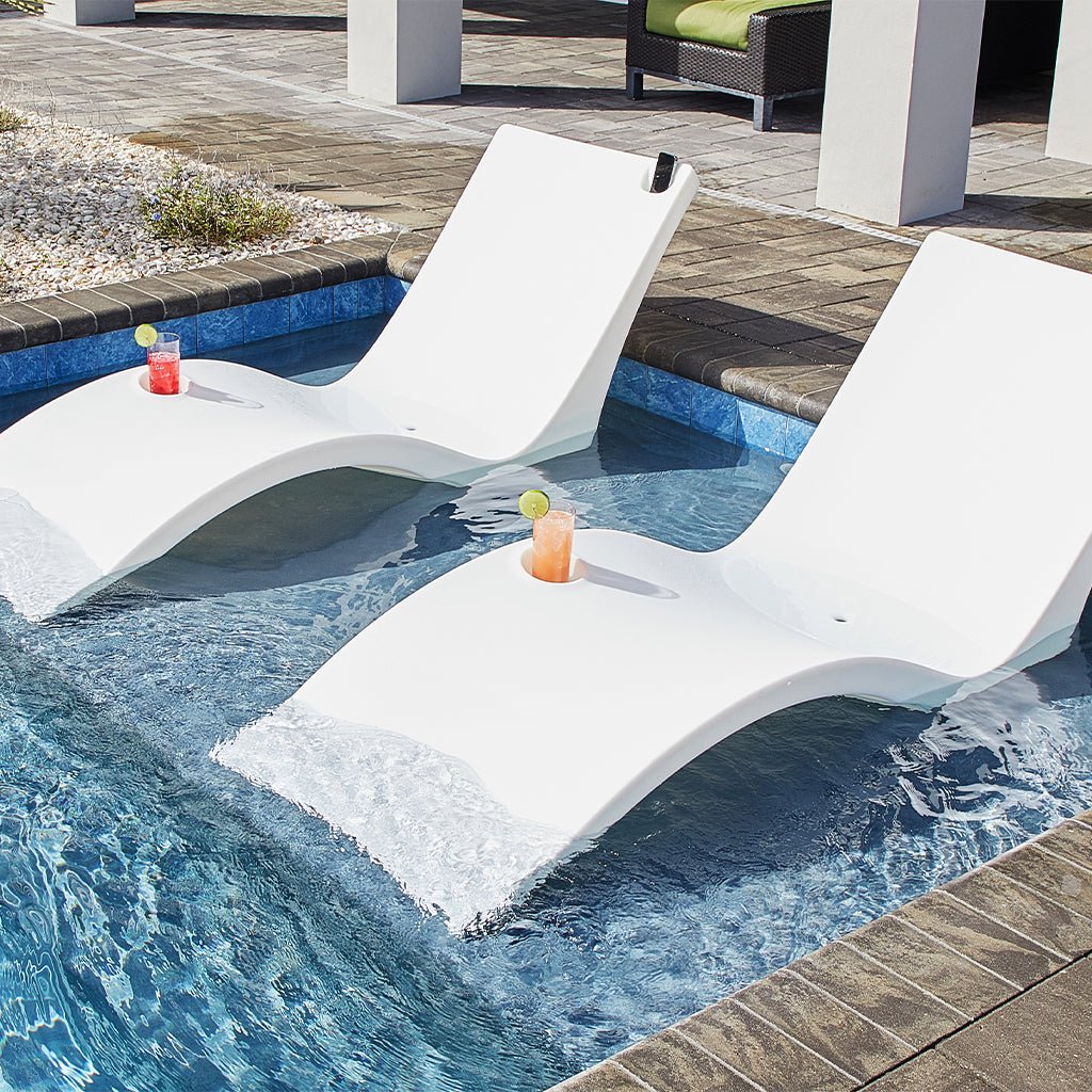 The Kai Shelf Lounger is a sleek and stylish luxury lounger intended for use in up to 9" of water. Featuring an integrated cup and phone holder, these pool lounge chairs are made to ensure a comfortable experience year round. Manufactured with high-quality materials, it's the perfect choice for those who enjoy an outdoor lifestyle. Use it in a tanning ledge or Baja shelf to stay partially in the water and relax in this durable and aesthetically pleasing accessory.