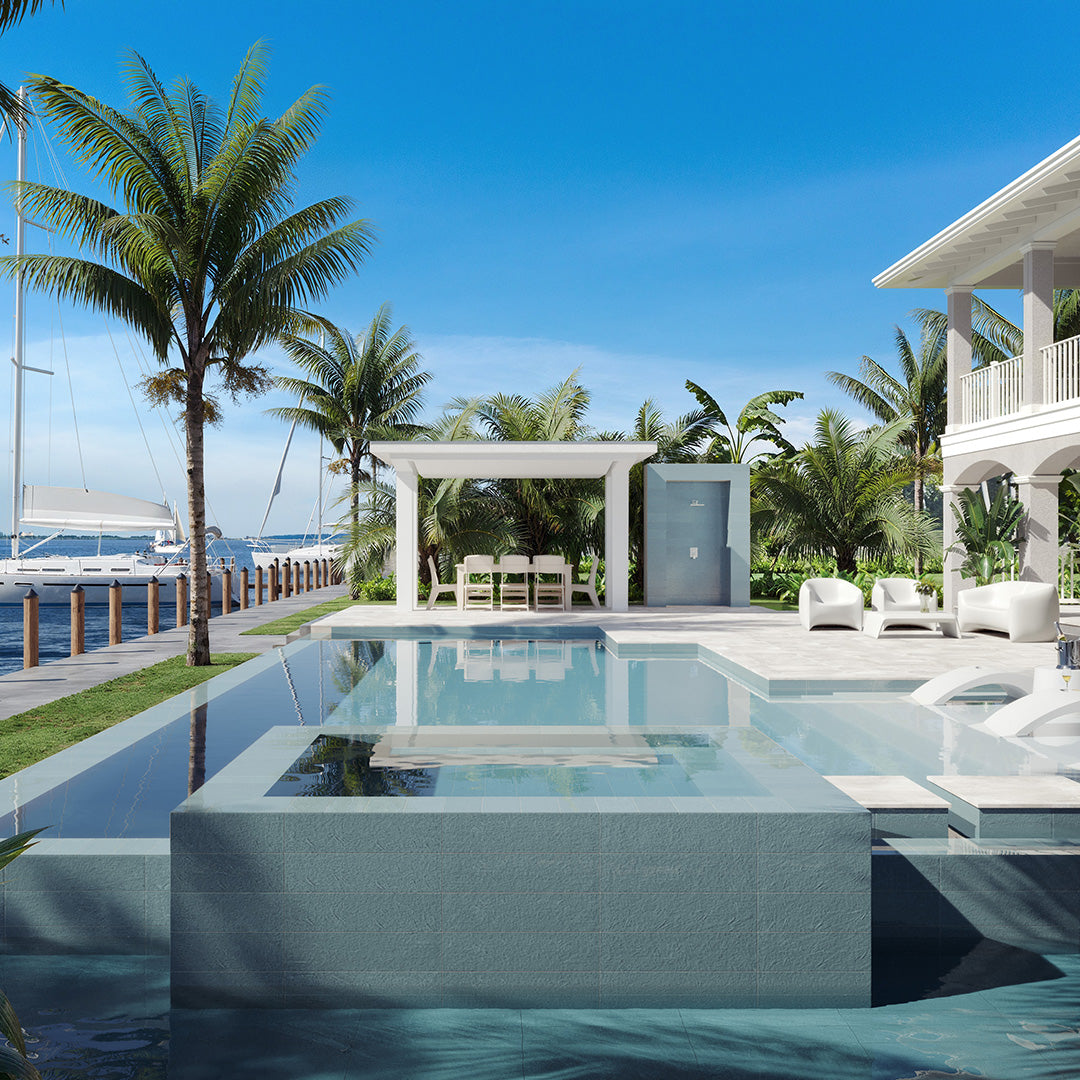 With a crisp, contemporary color palette, the Tiderock Porcelain Pool Tile Collection brings a refined sense of style to any environment - from luxury pool waterlines and outdoor living spaces to modern kitchens and spa-inspired bathrooms. Crafted in the USA with 100% regionally sourced materials, Tiderock’s versatile hues and textures echo the look of handmade ceramics, adding warmth, character, and depth to both residential and commercial designs.