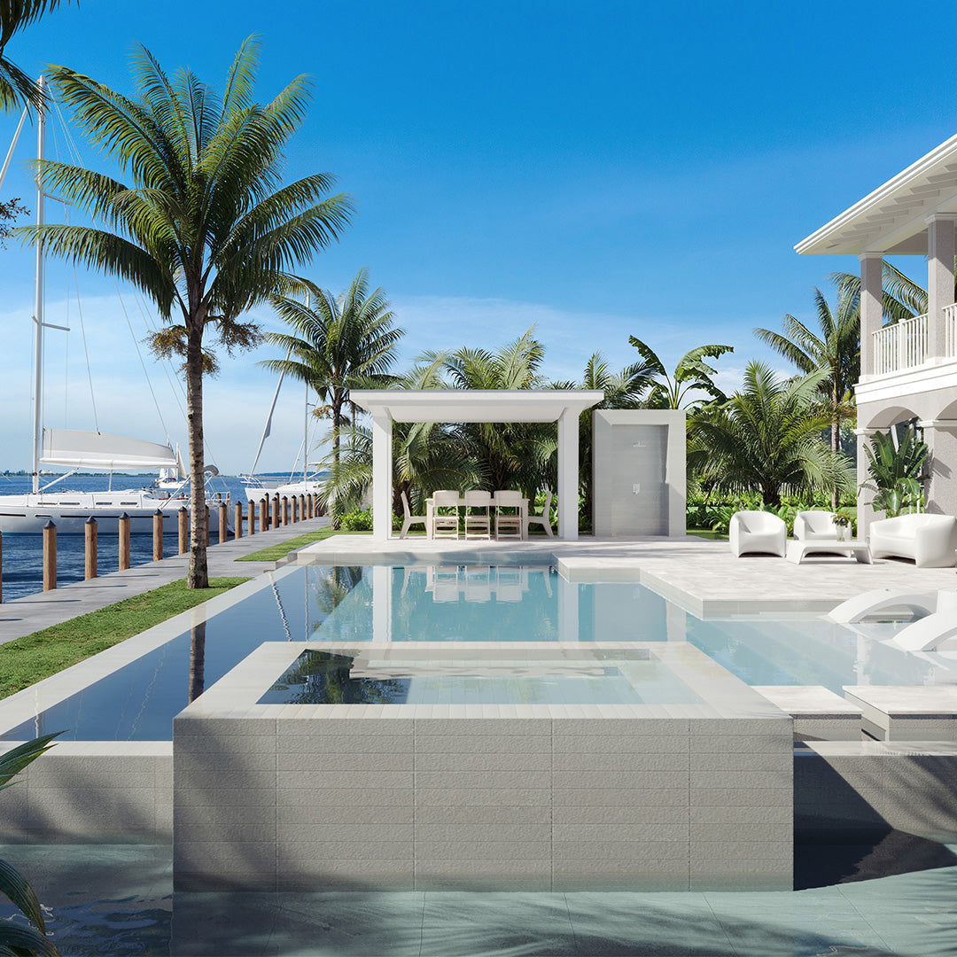 With a crisp, contemporary color palette, the Tiderock Porcelain Pool Tile Collection brings a refined sense of style to any environment - from luxury pool waterlines and outdoor living spaces to modern kitchens and spa-inspired bathrooms. Crafted in the USA with 100% regionally sourced materials, Tiderock’s versatile hues and textures echo the look of handmade ceramics, adding warmth, character, and depth to both residential and commercial designs.